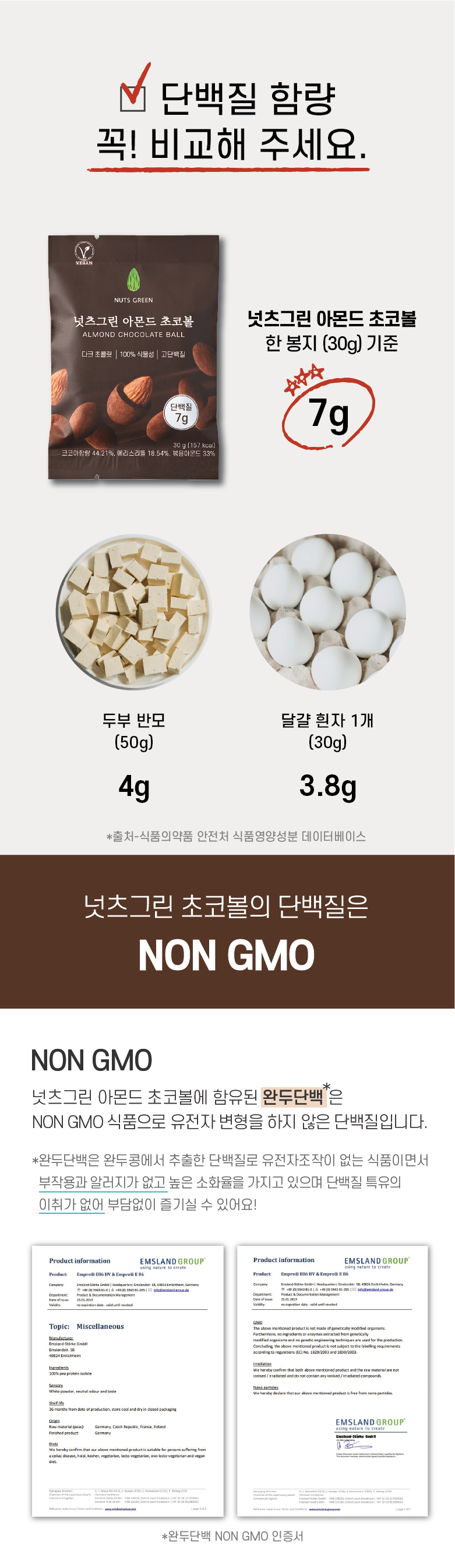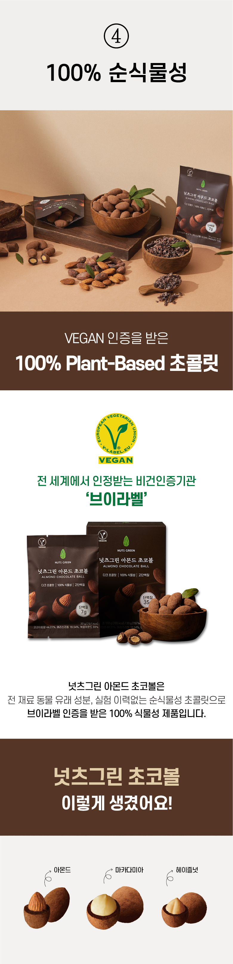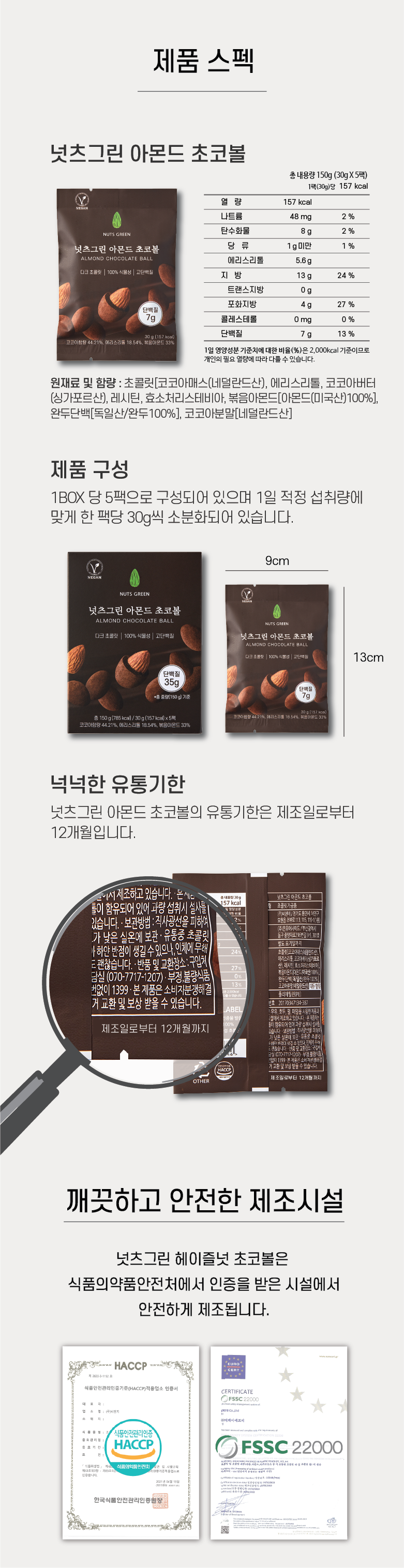 초콜릿[코코아매스(네덜란드산), 에리스리톨, 코코아버터(싱가포르산),레시틴, 효소처리스테비아], 볶음아몬드[아몬드(미국산)100%], 완두단백[독일산/완두100%]. 코코아분말(네덜란드산)