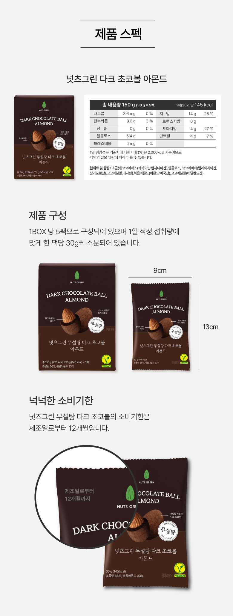 초콜릿[코코아매스(네덜란드산), 에리스리톨, 코코아버터(싱가포르산),레시틴, 효소처리스테비아], 볶음아몬드[아몬드(미국산)100%], 완두단백[독일산/완두100%]. 코코아분말(네덜란드산)