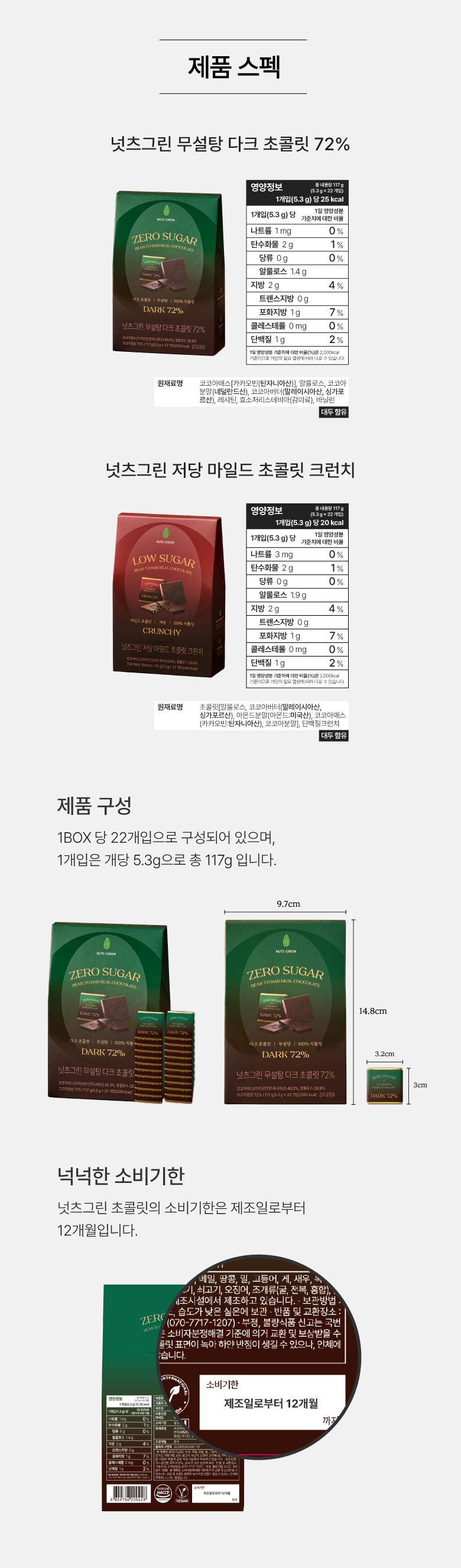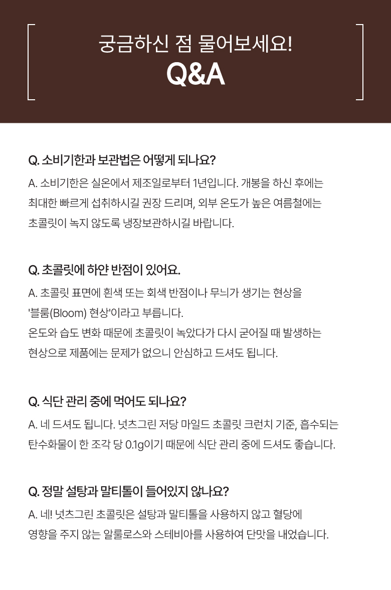 초콜릿[코코아매스(네덜란드산), 에리스리톨, 코코아버터(싱가포르산),레시틴, 효소처리스테비아], 볶음아몬드[아몬드(미국산)100%], 완두단백[독일산/완두100%]. 코코아분말(네덜란드산)