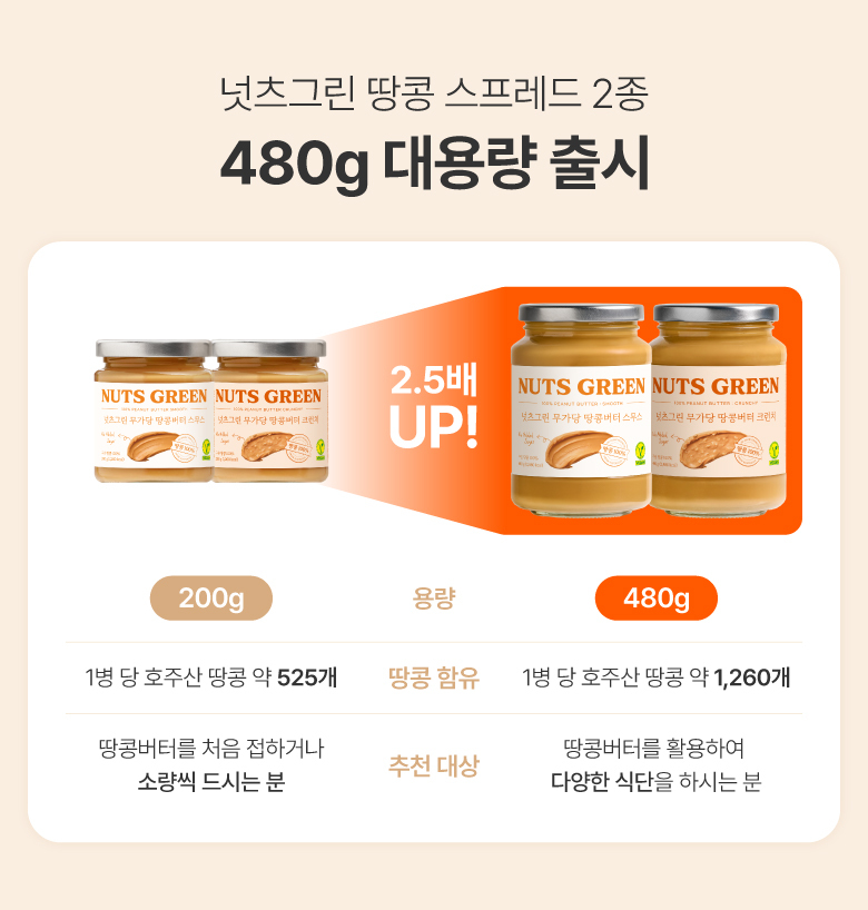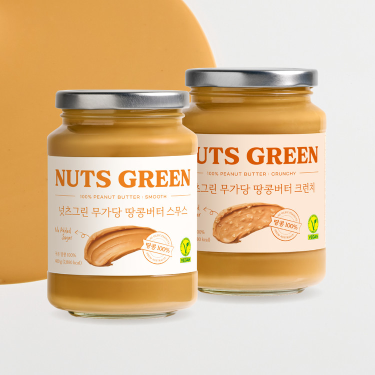 [2병 SET] 넛츠그린 대용량 무가당 땅콩버터 스무스&크런치 480g (교차구매 가능)